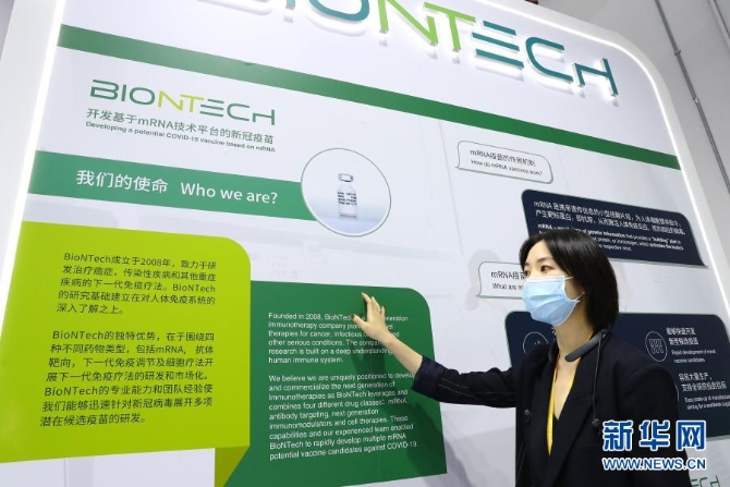 11月5日,在第三届中国国际进口博览会上,工作人员在医疗器械及医药健康展区介绍由复星医药与德国拜恩泰科合作开发的新冠病毒mRNA(信使核糖核酸)疫苗。新华社记者 张玉薇 摄