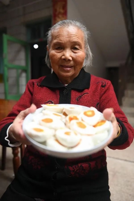 全国脱贫攻坚奖奋进奖获得者廖秀英老奶奶在赣州瑞金市叶坪乡凤岗村家中向游客展示咸鸭蛋 刘青 摄