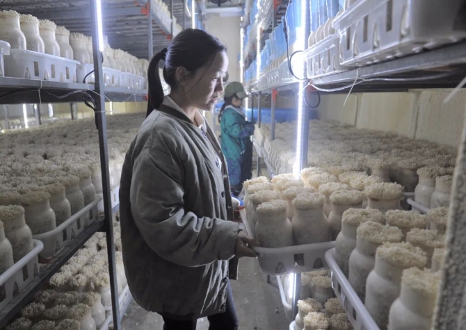 赣州市章贡区沙石镇火燃村的贫困户家庭成员,在扶贫车间低温环境下从事蘑菇生产,实现就业脱贫 李传材 摄