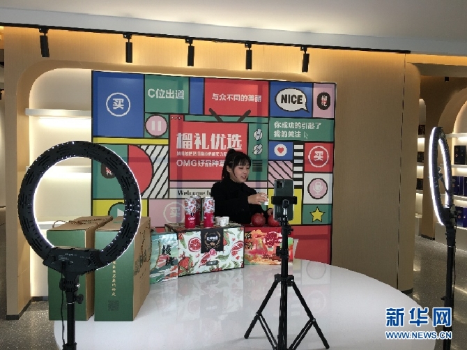 (工作人员正在为石榴、石榴饮品等产品进行直播带货。 新华网 于杨 摄)