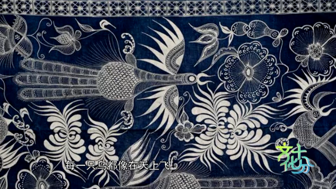苗族蜡染设计师 成昊:蜡染,纯天然的染料,那我们是一点化学染料不要有的,纯手工绘画,当然这些在现代的机械化社会里呢,它们是很复杂,很耗时。那比如说我们现在用机器去印的话,我们可以打出一个模子无限复制,但你会发现它的鸟都是一样的,没有情绪的。那我们这里画娘纯手工画的,每一个鸟都像在天上飞,每一个鱼都像在水里游,每一朵花你就感觉到它下一个花瓣马上要迸开的这种效果,这个是蜡染的最灵魂的东西。