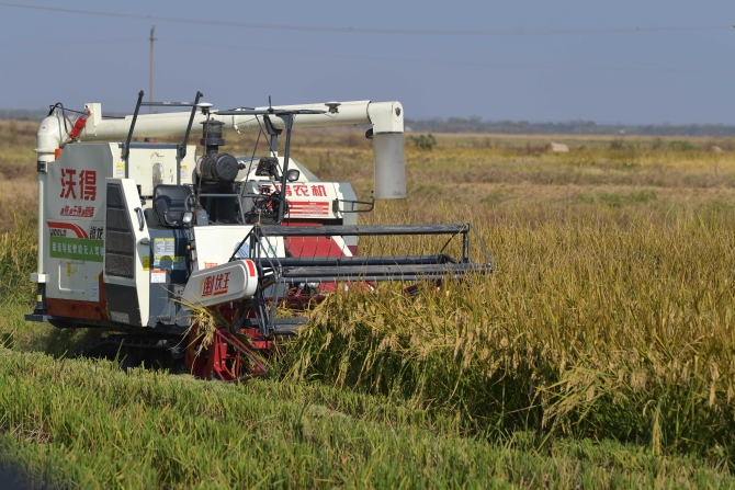11月14日,在江西省南昌县蒋巷镇大田农社智慧农场,无人收割机在现场演示水稻收割。