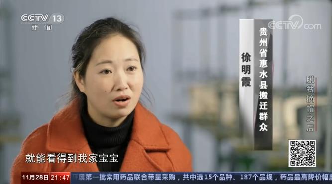 贵州省惠水县搬迁群众 徐明霞:我现在就是很稳定了,我有4000多元(工资),我一下班回去,就能看得到我家宝宝,还有我公公婆婆,那就是一家人,虽然我在里面加班很辛苦,但是我回去看到他们以后,我就一点都不辛苦。