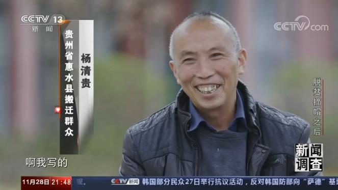 贵州省惠水县搬迁群众 杨清贵:移民搬出大山了,手提行李住新房,看病就在家门口,儿童送进新学堂,户户有人去上岗,两不愁来三保障,全靠政府扛大头。