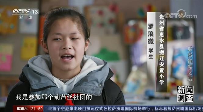 贵州省惠水县搬迁安置小学学生 罗浪微: 以前我们的学校特别小,它没有操场、美术室、音乐室,来到这边,体育课也有,音乐课也有,美术课也有,我最喜欢的就是这个学校有社团活动,我是参加那个葫芦丝社团。