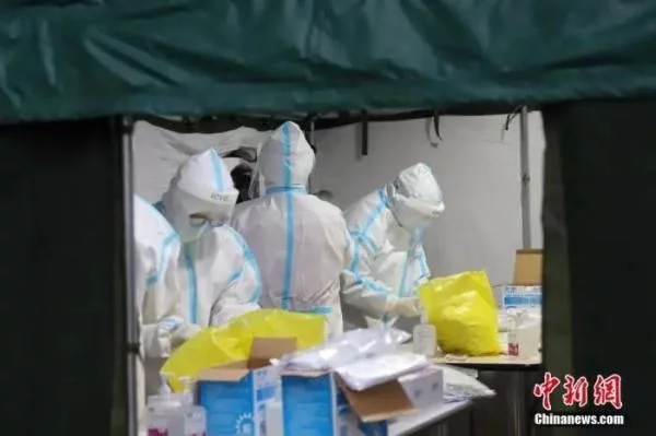 11月21日,受新冠肺炎疫情影响,天津市滨海新区对辖区内全体居民进行大规模核酸检测筛查。图为核酸检测取样现场忙碌的医务工作者。中新社记者 张道正 摄