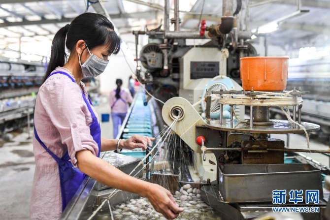 工人在广西凌云县一家缫丝厂内煮茧抽丝(4月17日摄)。新华社记者 曹祎铭 摄