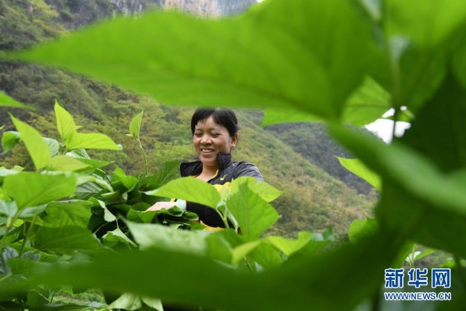 在广西百色市凌云县下甲镇加西村,当地村民在采摘桑叶(2019年3月27日摄)。新华社记者 陆波岸 摄