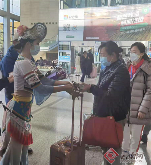 刚下飞机的游客就收到了云南鲜花作为礼物。供图