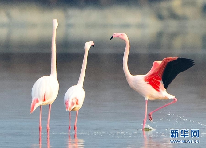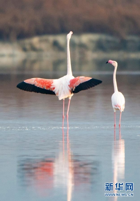 随着气温下降,一些火烈鸟飞抵山西运城盐湖,成为冬日盐湖一道美丽的风景。新华社记者 马毅敏 摄