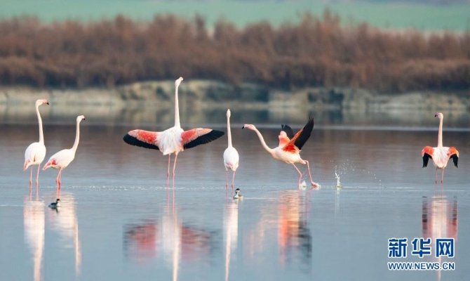 这是12月4日在山西运城盐湖拍摄的火烈鸟。随着气温下降,一些火烈鸟飞抵山西运城盐湖,成为冬日盐湖一道美丽的风景。新华社记者 马毅敏 摄
