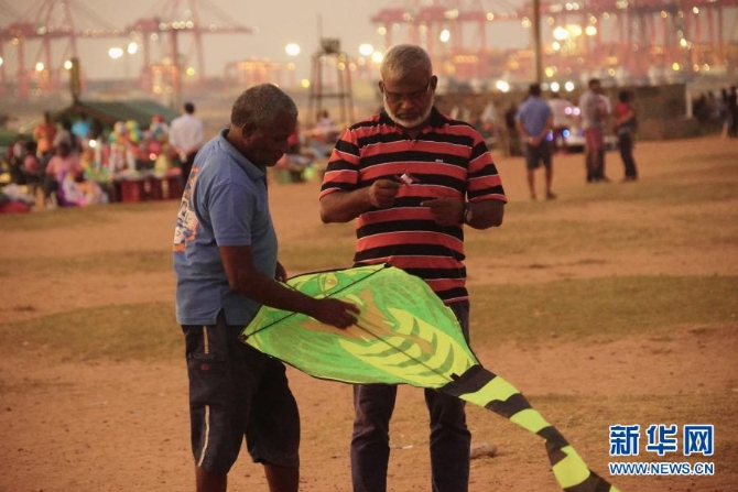 这张拍摄于2019年1月10日的资料照片显示,纳瓦(左)在斯里兰卡首都科伦坡加勒菲斯绿地广场上帮助一名游客调整风筝。新华社记者 唐璐/摄