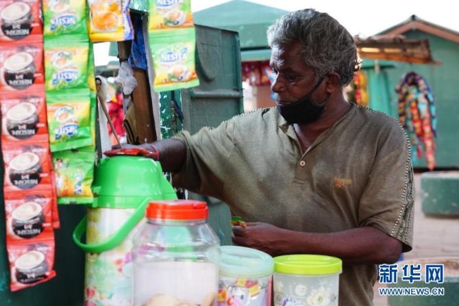 11月29日,在斯里兰卡首都科伦坡加勒菲斯绿地广场,纳瓦在食品摊为顾客准备茶水。新华社记者 唐璐/摄