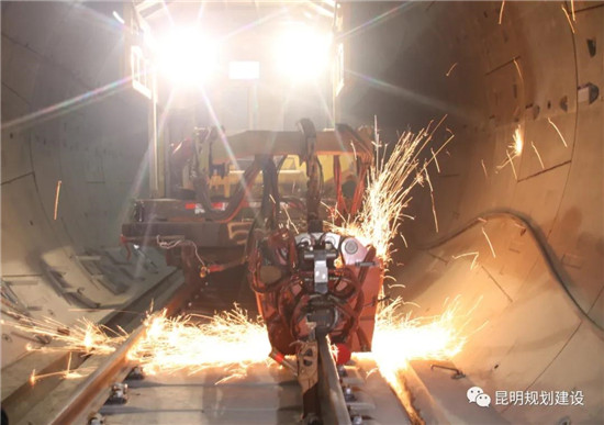 12月8日,在昆明地铁5号线金家河站,两根25米长的钢轨在电光火石飞溅中实现了无缝焊接,标志着5号线全线焊轨作业拉开序幕。