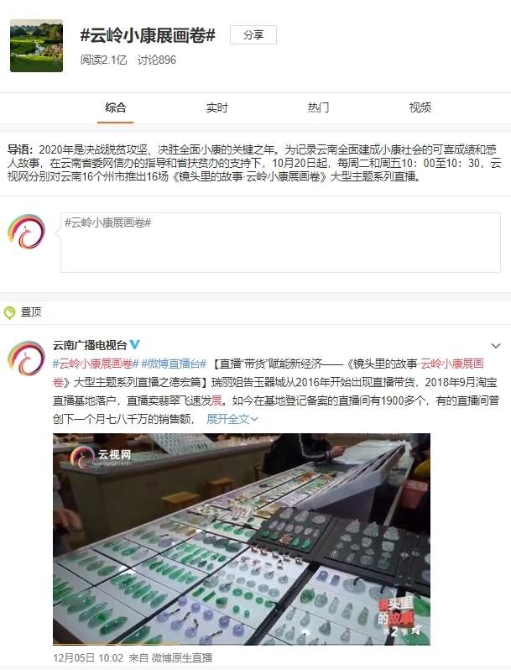 云南省德宏傣族景颇族自治州瑞丽市有"玉出云南·玉从瑞丽"的美誉,是我国重要的珠宝翡翠集散地之一。12月8日,《镜头里的故事·云岭小康展画卷》大型主题系列直播走进瑞丽姐告玉城,带网友身临其境的感受了数字经济给珠宝玉石产业带来的活力。据统计,本场直播全网阅读量782万,系列直播全网阅读量累计超过2.6亿。其中,"云岭小康展画卷"微博话题阅读量累计超过2.1亿。
