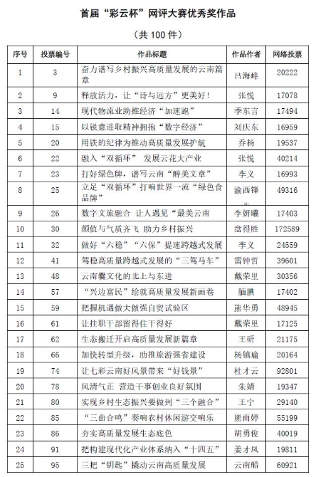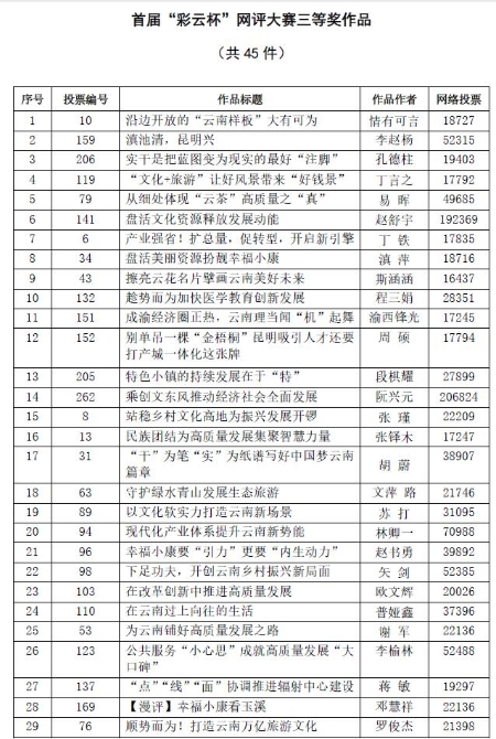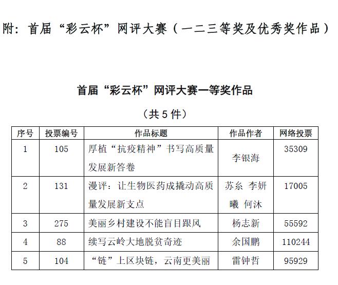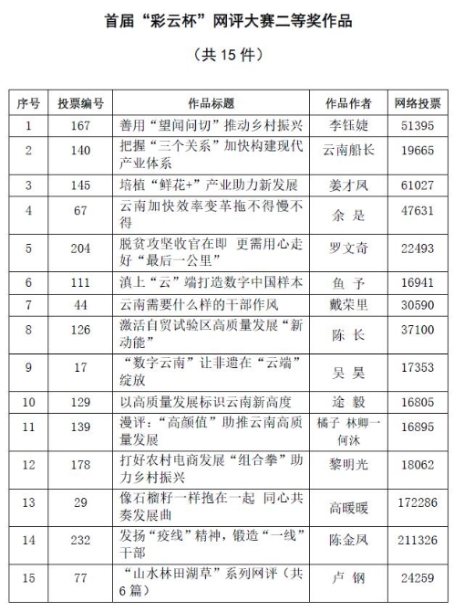 12月8日下午,以“聚焦云南高质量跨越式发展”为主题的首届“彩云杯”网评大赛落下帷幕。经大赛终评评委会评定,决出一二三等奖及优秀奖。