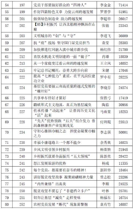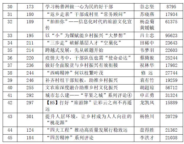决赛阶段,由省委宣传部、省记协、省作家协会、云南高校、省级媒体等专家评委组成的终评会,对165件作品进行评审,评选出《厚植“抗疫精神”书写高质量发展新答卷》等一等奖作品5件、《把握“三个关系”加快构建现代产业体系》等二等奖作品15件、《沿边开放的“云南样板”大有可为》等三等奖作品45件,以及优秀奖作品100件。其中,一等奖作品《漫评:让生物医药成撬动高质量发展新支点》,采用形式新颖的漫画方式,图文并茂,逻辑严谨,说理生动,将“硬”主题充分“软化”呈现,较好体现了“网络特色”,获得评委一致认可。《美丽乡村建设不能盲目跟风》一文则坚持问题导向,针对美丽乡村建设存在雷声大雨点小、简单模仿、盲目跟风等苗头性问题,从规划引领、“找”准发展定位,打造精品、“提”高服务水平,洁净生态、“做”优乡村底色,发展民宿、“共”享社会红利四方面,旗帜鲜明指出,云南建设美丽乡村需要因地制宜,更需要科学规划,切勿盲目跟风,相互攀比。类似优秀作品比比皆是,各行各业、省内省外的不同专家学者,纷纷通过见证者、受益者、参与者和推动者等视角,为云南发展提建议、出思路、想措施,为推动云南高质量发展营造了良好的舆论氛围。