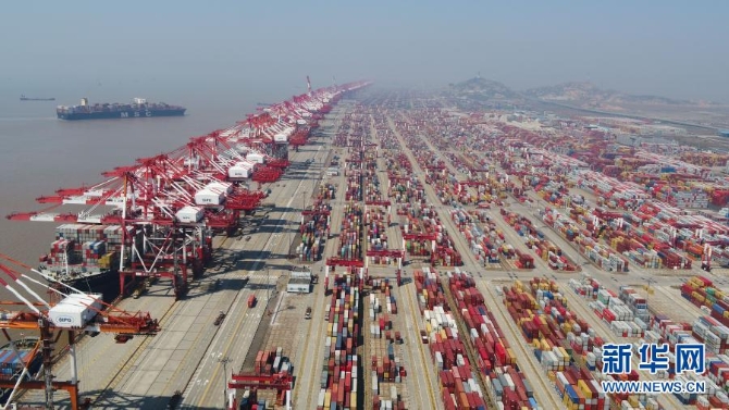 这是3月18日拍摄的上海洋山港集装箱码头(无人机照片)。新华社 记者丁汀/摄