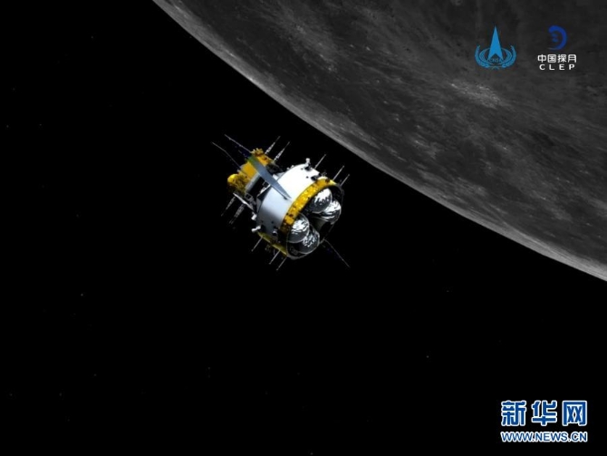 轨返组合体与上升器分离前模拟图。记者从国家航天局获悉,北京时间12月6日12时35分,嫦娥五号轨道器返回器组合体与上升器成功分离,进入环月等待阶段,准备择机返回地球。新华社发(国家航天局供图)