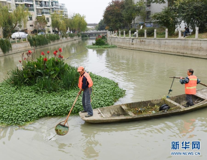 11月16日,工作人员在浙江湖州吴兴区环渚街道藤桥港河道里清除杂物。新华社记者 翁忻旸 摄