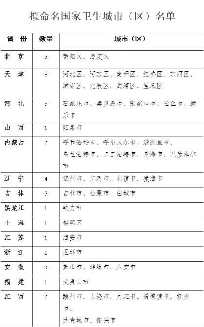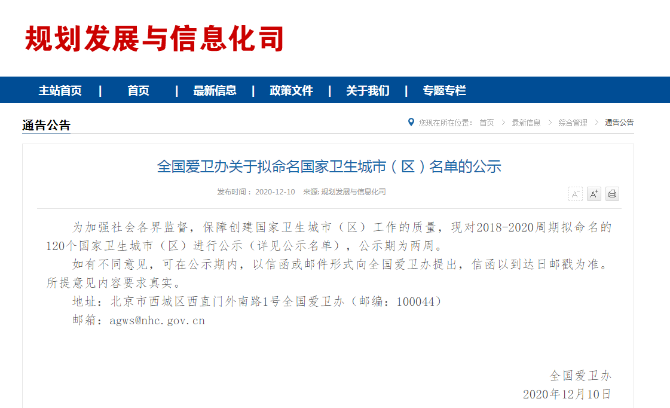 12月10日,国家卫健委发布《全国爱卫办关于拟命名国家卫生城市(区)名单的公示》,对2018-2020周期拟命名的120个国家卫生城市(区)进行公示,公示期为两周。