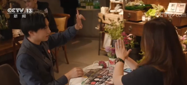 莉莉时光咖啡馆店主 章莉莉:我也希望在店里更多的是让更多的人了解这个群体,手语非常美,你看这个“爱”(手语),我爱你的话一定是觉得你很棒,然后爱是有触摸的,当他触摸的时候,他们就会有爱的流动,哪怕只是一个眼神,那也是一种交流。