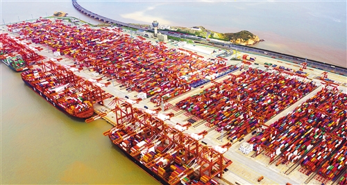 10月25日,上海洋山深水港码头多艘集装箱货轮正在紧张装卸。计海新/摄