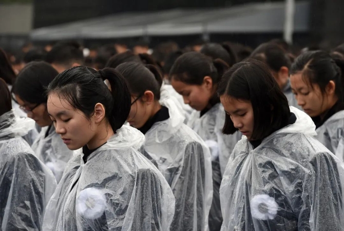 2016年12月13日,学生代表在南京大屠杀死难者国家公祭仪式上默哀。新华社发