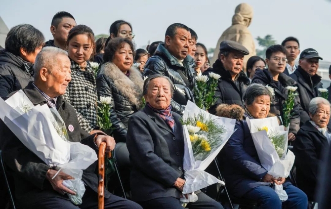 2019年12月3日,南京大屠杀幸存者葛道荣(前排左一)、夏淑琴(前排左二)、艾义英(前排右一)及新确认死难者周万荣的女儿陶秀华(前排右二)在家祭活动现场。新华社记者 李博 摄