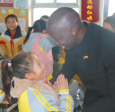 杜牧同为陕西省合阳县坊镇中心小学五年级学生作中非国别文化报告,课后与小学生互动交流。资料图片