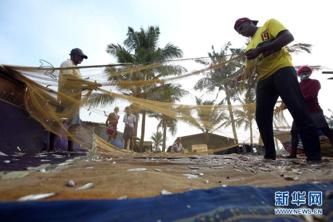 12月12日,在斯里兰卡首都科伦坡附近的莫勒图沃,渔民在海边整理渔网。新华社发(阿吉特·佩雷拉/摄)