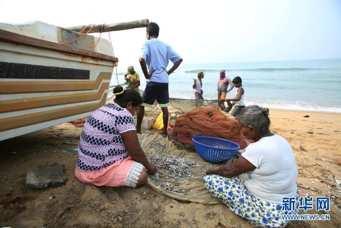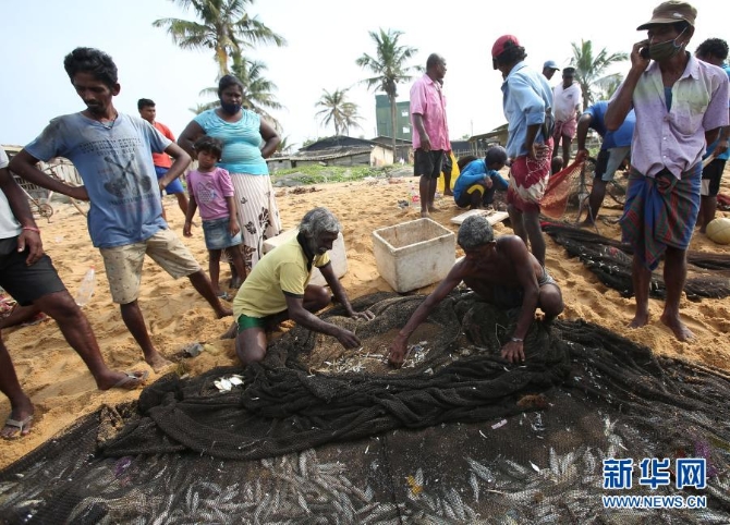 12月12日,在斯里兰卡首都科伦坡附近的莫勒图沃,渔民在海边分拣捕获的鱼。新华社发(阿吉特·佩雷拉/摄)