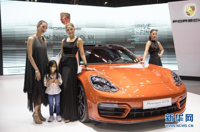 12月13日,一个小女孩在泰国曼谷举办的第37届泰国国际汽车博览会上与车模合影。新华社记者 张可任/摄