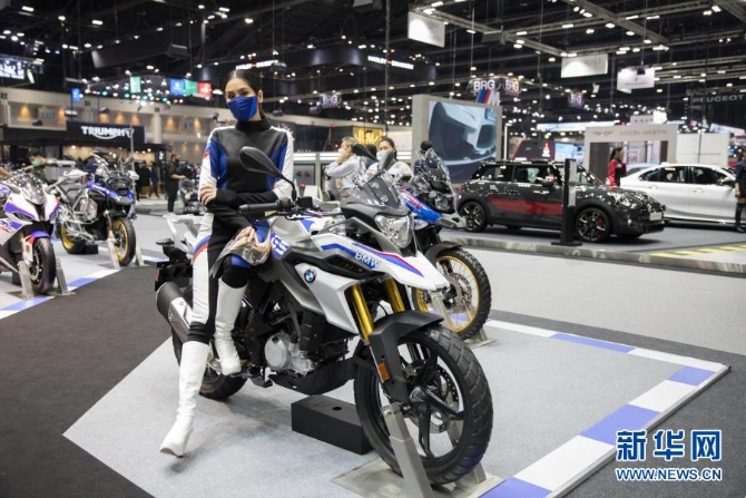 12月13日,一名车模在泰国曼谷举办的第37届泰国国际汽车博览会上展示摩托车。新华社记者 张可任/摄