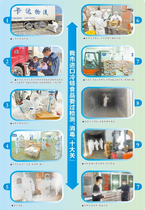 截至目前,监管仓已规划出专门的运输车辆进出通道,设置了相关指示标识,设立了专门装卸月台,消毒场所、转运场所、办公场所等已安装专门的远程监控系统等。同时,制定了完善的进口冷链食品出入库流程、核酸检测流程、消毒流程、废弃外包装袋(箱)的处置流程,并制定了进口冷链食品报备表、入库查验情况登记表、车辆及环境消毒登记表、集中监管仓出库证明,规定废弃外包装袋(箱)消毒需参照医疗废弃物消毒进行处理等。