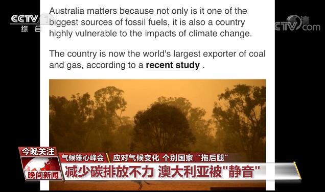 本年度的气候雄心峰会上,澳大利亚没有收到邀请在大会上发言。英国广播公司的报道认为,在过去5年中,澳大利亚在履行巴黎协定承诺方面和其他国家的差距越来越大,2000多万人口碳排放总量占全球3.6%。