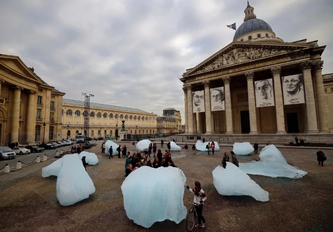 △当地时间2015年12月3日,巴黎气候大会期间,艺术家将从格陵兰岛运来的冰块放置在先贤祠前,打造了名为“看冰”的艺术作品(图片来源:视觉中国)