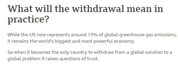 △英国广播公司网站发表的一篇文章称,美国排放的温室气体占全球排放量的15%,其退出《巴黎协定》给全球减排事业造成了“信任问题”(图片来源:英国广播公司网站截图)
