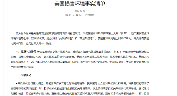 △2020年10月19日,中国外交部正式发布《美国损害环境事实清单》(图片来源:中国外交部网站)