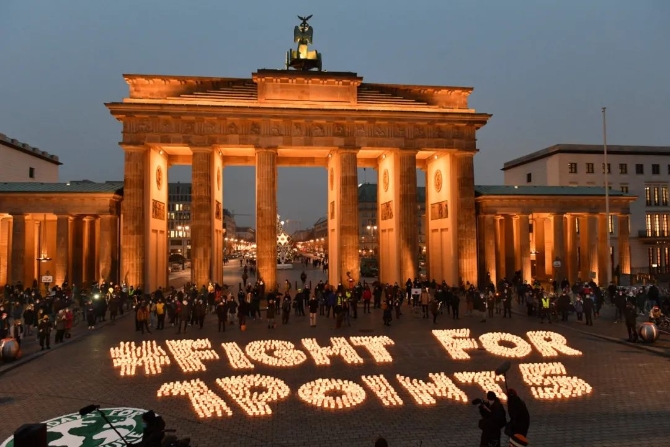 △当地时间2020年12月11日,支持积极应对气候变化的人士在柏林勃兰登堡门前点燃蜡烛,拼出“为1.5摄氏度而战”的口号(图片来源:视觉中国)