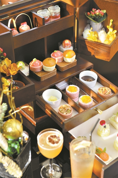 隐匿于花园锦鲤池畔的幽雅空间及穿越满眼落英缤纷的神秘玻璃长廊,呈现于眼前的是优雅蓝调酒吧,在此享用一杯暖冬特饮“Warm U UP暖”,加热威士忌再作为基酒,能在保持香味的同时降低酒精浓度,让特调在入喉时更加顺滑,温暖冬日。午后阳光,酒香馥郁,瀑布飞流直下,锦鲤水中游。精选新鲜水果、美国芝士、香浓巧克力以及美味海鲜组合成12款精美点心,再搭配精心特调鸡尾酒,无比惬意。而在万丽的“逸庭吧”(R Bar),夜晚与白天是两张各有风情的面孔。夜晚是风情万种的都市女郎,下午时刻是优雅的淑女。高空之中,景致一览无余,下午茶套餐里融入了西点师的奇思妙想。