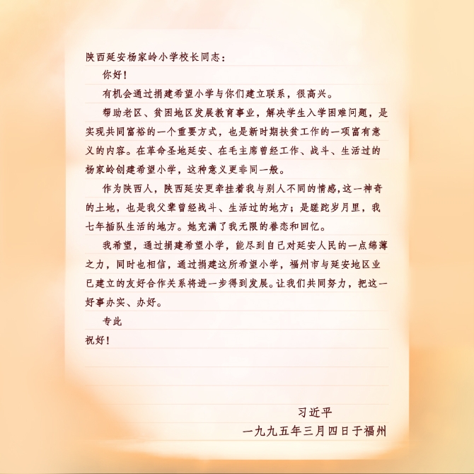 2008年5月21日,杨家岭福州希望小学的孩子们给时任国家副主席的习近平写信,汇报他们向汶川灾区小朋友捐款捐物和自己日常学习生活情况。10天后,他们收到了回信。信中,习近平勉励他们发扬延安精神,勤奋学习,健康成长,努力成为社会主义事业接班人。
