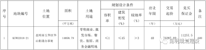 此宗土地编号为KCWH2018-21号地块,地块性质为零售商业、批发市场、餐饮、旅馆、商务金融用地,面积约22.29亩,容积率≤1,建筑密度≤45%,绿地率>3%,交易起价56287.89万元,竞价阶梯为600万元,起始土地单价约2525.46万元/亩。