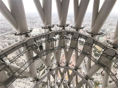 16日,记者探秘广州塔“天眼步道”全新空间,在325米高空体验镂空步道。步道高空无护栏的设计,让体验者有“高处不胜寒”和“步步惊心”之感。在这里,记者看到,广州塔内核心筒与钢结构空间在这里被利用起来。步道外观金属感十足,与广州塔原有圆环结构,形成鲜明对比,有着很强的视觉冲击力,展现出独特的工业美感。