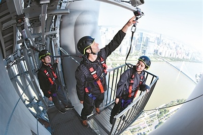 在安全教练的带领下,记者围绕广州塔身凌空步行一周,途中挑战了惊险刺激的“天眼”。教练先让记者在一个特殊安全装置上站好,系好安全带后,教练按下按钮,这个装置的底部开始向右旋转,记者全身瞬间置于广州塔体之外,这时鼓足勇气、睁大眼睛,往东可以看到大片的绿地、行进中的有轨电车、奔流的珠江、琶洲和珠江新城的建筑群,视野开阔,感觉新奇。