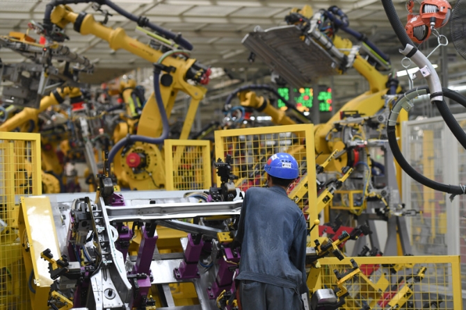 △2020年9月15日,在上汽集团乘用车宁德基地车身车间,工人操作机器人分拼汽车板材。