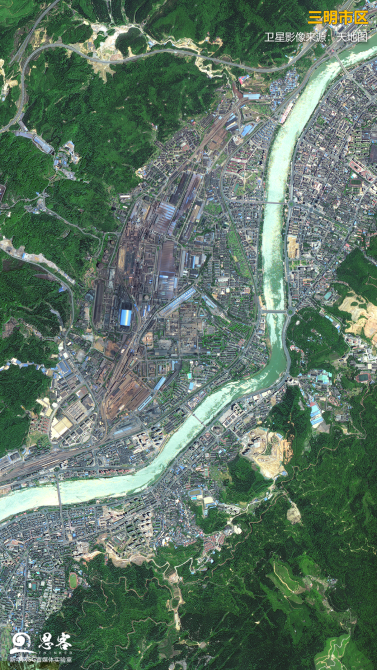 三明因三钢而兴,先有工厂后有城,在三明沙溪河畔列西拔地而起的三明钢铁厂,在卫星影像上清晰可见。