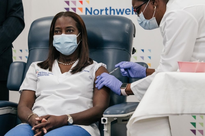 12月14日,在纽约长岛犹太医疗中心,重症监护室护士桑德拉·琳赛(左)接种新冠疫苗。新华社发(纽约州州长办公室供图)