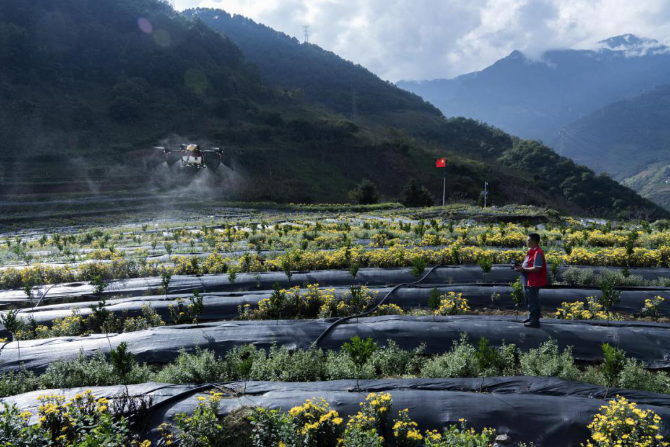 ▲怒江州泸水市多多农园带头人左雪峰变身飞手,使用无人机喷药, 300亩橘园几天就能完成标准化喷药工作,这一基地的智慧农业系统由赵春江院士团队与拼多多联合建设。(摄影:穆功)