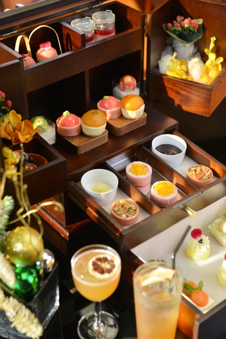 困倦的午后,能量加持少不得。此时,不妨来杯暖饮、几件小点。隐匿于花园锦鲤池畔的幽雅空间及穿越满眼落英缤纷的神秘玻璃长廊,呈现于眼前的是优雅蓝调酒吧,在此享用一杯暖冬特饮“Warm U UP暖”,加热威士忌再作为基酒,能在保持香味的同时降低酒精浓度,让特调在入喉时更加顺滑,温暖冬日。午后阳光,酒香馥郁,瀑布飞流直下,锦鲤水中游。精选新鲜水果、美国芝士、香浓巧克力以及美味海鲜组合成12款精美点心,再搭配精心特调鸡尾酒,无比惬意。而在万丽的“逸庭吧”(R Bar),夜晚与白天是两张各有风情的面孔。夜晚是风情万种的都市女郎,下午时刻是优雅的淑女。高空之中,景致一览无余,下午茶套餐里融入了西点师的奇思妙想。